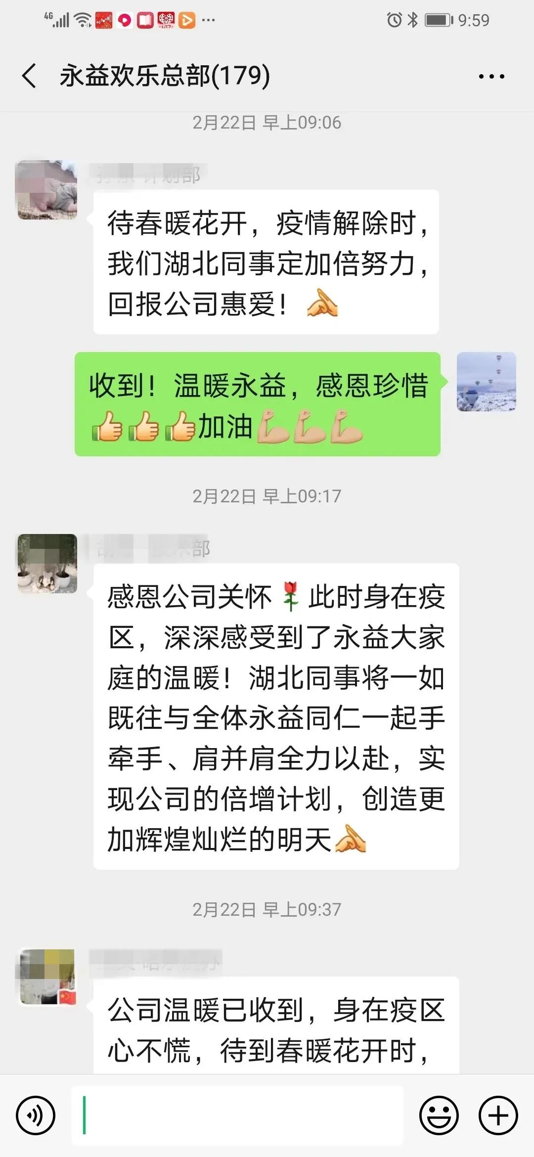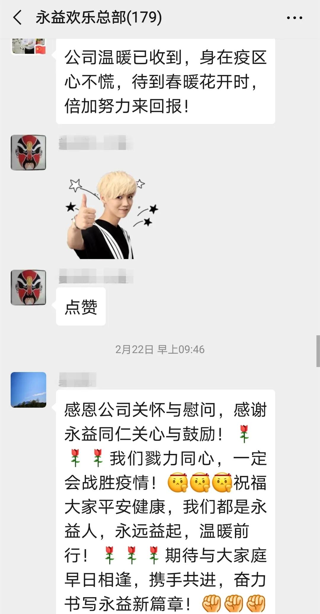 “感恩公司关怀与慰问,感谢永益所有同仁关心与鼓励,大家勠力同心,一定会战胜疫情。”