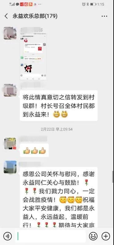 “我将公司的慰问信转发我们村的微信群,村长号召村民们都到永益工作。”